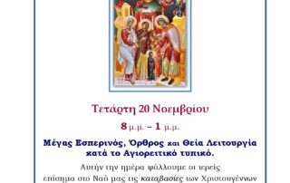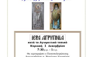 By Nikos Samolis|2024-11-27T19:02:33+02:0023 Νοεμβρίου, 2024|Categories: Announcements, Uncategorized, Ανακοινώσεις|Δεν επιτρέπεται σχολιασμός στο ΑΓΡΥΠΝΙΑ ΠΑΝΑΓΙΑΣ ΓΕΡΟΝΤΙΣΣΑΣ ΑΓΙΟΥ ΠΟΡΦΥΡΙΟΥ