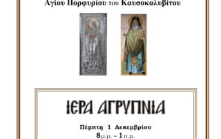 By Mimis Vasileiou|2022-11-29T09:25:19+02:0029 Νοεμβρίου, 2022|Categories: Ανακοινώσεις|Δεν επιτρέπεται σχολιασμός στο Ιερά Αγρυπνία Πέμπτη 1 Δεκεμβρίου 2022