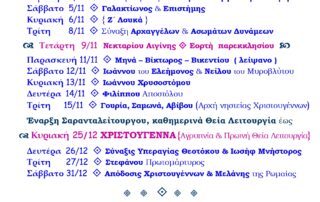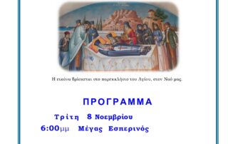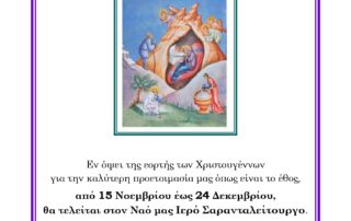 By Mimis Vasileiou|2022-11-01T17:05:03+02:001 Νοεμβρίου, 2022|Categories: Ανακοινώσεις|Δεν επιτρέπεται σχολιασμός στο Πρόγραμμα Θείων Λειτουργιών & Ακολουθιών Νοεμβρίου και Δεκεμβρίου του Ιερού Ναού Αγίας Παρασκευής Νέας Πεντέλης