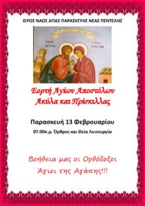 View Larger Image ΕΟΡΤΗ ΑΠΟΣΤΟΛΩΝ ΑΚΥΛΑΣ ΚΑΙ ΠΡΙΣΚΙΛΛΑΣ By Nikos Samolis|2026-02-11T23:57:21+02:0011 Φεβρουαρίου, 2026|Announcements, Ανακοινώσεις|Δεν επιτρέπεται σχολιασμός στο ΕΟΡΤΗ ΑΠΟΣΤΟΛΩΝ ΑΚΥΛΑΣ ΚΑΙ ΠΡΙΣΚΙΛΛΑΣ Share This Story, Choose Your Platform! FacebookTwitterLinkedInRedditWhatsAppTumblrPinterestVkEmail About the Author: Nikos Samolis Σχετικά Άρθρα Γ΄ Κυριακή Σταυροπροσκυνήσεως Γ Στάση Χαιρετισμών της Παναγίας Β΄ Στάση Χαιρετισμών Πρόγραμμα Μαρτίου 2026 A Στάση Χαιρετισμών