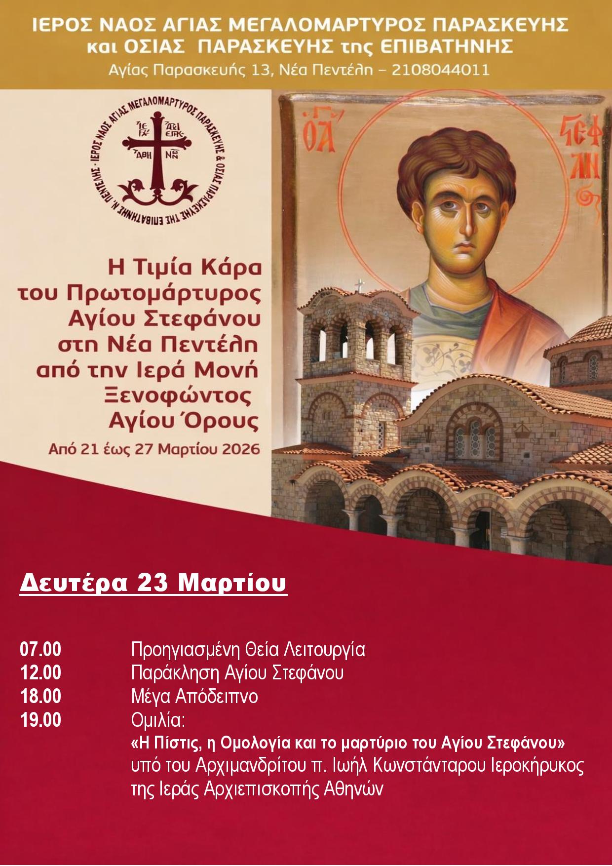 View Larger Image Δευτέρα 23 Μαρτίου Κάρας Αγίου Στεφάνου By Nikos Samolis|2026-03-23T15:44:09+02:0023 Μαρτίου, 2026|Announcements, Ανακοινώσεις|Δεν επιτρέπεται σχολιασμός στο Δευτέρα 23 Μαρτίου Κάρας Αγίου Στεφάνου Share This Story, Choose Your Platform! FacebookTwitterLinkedInRedditWhatsAppTumblrPinterestVkEmail About the Author: Nikos Samolis Σχετικά Άρθρα Τρίτη 24 Μαρτίου Κάρας Αγίου Στεφάνου Κυριακή 22 Μαρτίου Κάρας Αγίου Στεφάνου Yποδοχή Τιμίας Κάρας Αγίου Στεφάνου Δ΄ Στάση Χαιρετισμών Προσκύνημα Τιμίας κάρας Αγίου Στεφάνου