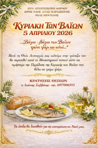 View Larger Image Εκδήλωση Κυριακή των Βαιών By Nikos Samolis|2026-03-30T22:55:42+03:0030 Μαρτίου, 2026|Announcements, Ανακοινώσεις|Δεν επιτρέπεται σχολιασμός στο Εκδήλωση Κυριακή των Βαιών Share This Story, Choose Your Platform! FacebookTwitterLinkedInRedditWhatsAppTumblrPinterestVkEmail About the Author: Nikos Samolis Σχετικά Άρθρα Ανοιξιάτικη Δωροέκθεση Xορός της Τράτας Kυριακή του Θωμά Πρόγραμμα Διακαινησίμου Εβδομάδος Kαλό Πάσχα!!!