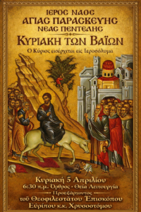 View Larger Image Θεία Λειτουργία Κυριακή των Βαίων By Nikos Samolis|2026-03-30T23:17:53+03:0030 Μαρτίου, 2026|Announcements, Ανακοινώσεις|Δεν επιτρέπεται σχολιασμός στο Θεία Λειτουργία Κυριακή των Βαίων Share This Story, Choose Your Platform! FacebookTwitterLinkedInRedditWhatsAppTumblrPinterestVkEmail About the Author: Nikos Samolis Σχετικά Άρθρα Kυριακή του Θωμά Πρόγραμμα Διακαινησίμου Εβδομάδος Kαλό Πάσχα!!! Πρόγραμμα Μεγάλης Εβδομάδας Λαζαράκια-Λιτανεία Κυριακής των Βαίων
