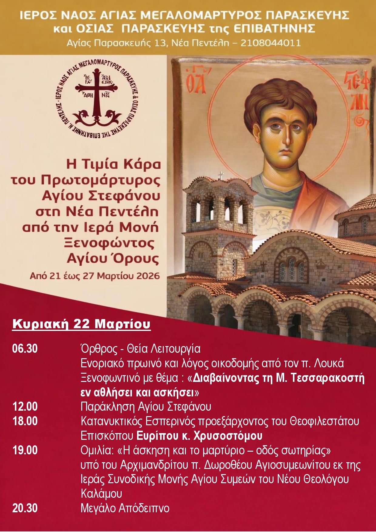 View Larger Image Κυριακή 22 Μαρτίου Κάρας Αγίου Στεφάνου By Nikos Samolis|2026-03-21T22:41:05+02:0021 Μαρτίου, 2026|Announcements, Ανακοινώσεις|Δεν επιτρέπεται σχολιασμός στο Κυριακή 22 Μαρτίου Κάρας Αγίου Στεφάνου Share This Story, Choose Your Platform! FacebookTwitterLinkedInRedditWhatsAppTumblrPinterestVkEmail About the Author: Nikos Samolis Σχετικά Άρθρα Τρίτη 24 Μαρτίου Κάρας Αγίου Στεφάνου Δευτέρα 23 Μαρτίου Κάρας Αγίου Στεφάνου Yποδοχή Τιμίας Κάρας Αγίου Στεφάνου Δ΄ Στάση Χαιρετισμών Προσκύνημα Τιμίας κάρας Αγίου Στεφάνου