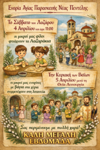 By Nikos Samolis|2026-03-30T22:58:27+03:0030 Μαρτίου, 2026|Announcements, Ανακοινώσεις|Δεν επιτρέπεται σχολιασμός στο Λαζαράκια-Λιτανεία Κυριακής των Βαίων