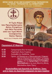 View Larger Image Παρασκευή 27 Μαρτίου Κάρας Αγίου Στεφάνου By Nikos Samolis|2026-03-26T23:26:30+02:0026 Μαρτίου, 2026|Announcements, Ανακοινώσεις|Δεν επιτρέπεται σχολιασμός στο Παρασκευή 27 Μαρτίου Κάρας Αγίου Στεφάνου Share This Story, Choose Your Platform! FacebookTwitterLinkedInRedditWhatsAppTumblrPinterestVkEmail About the Author: Nikos Samolis Σχετικά Άρθρα Ανοιξιάτικη Δωροέκθεση Xορός της Τράτας Kυριακή του Θωμά Πρόγραμμα Διακαινησίμου Εβδομάδος Kαλό Πάσχα!!!
