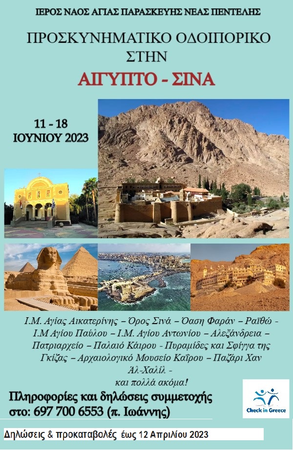 By Mimis Vasileiou|2023-04-05T09:38:49+03:005 Απριλίου, 2023|Ανακοινώσεις|Δεν επιτρέπεται σχολιασμός στο Προσκυνηματικό Οδοιπορικό στην Αίγυπτο – Σινά
