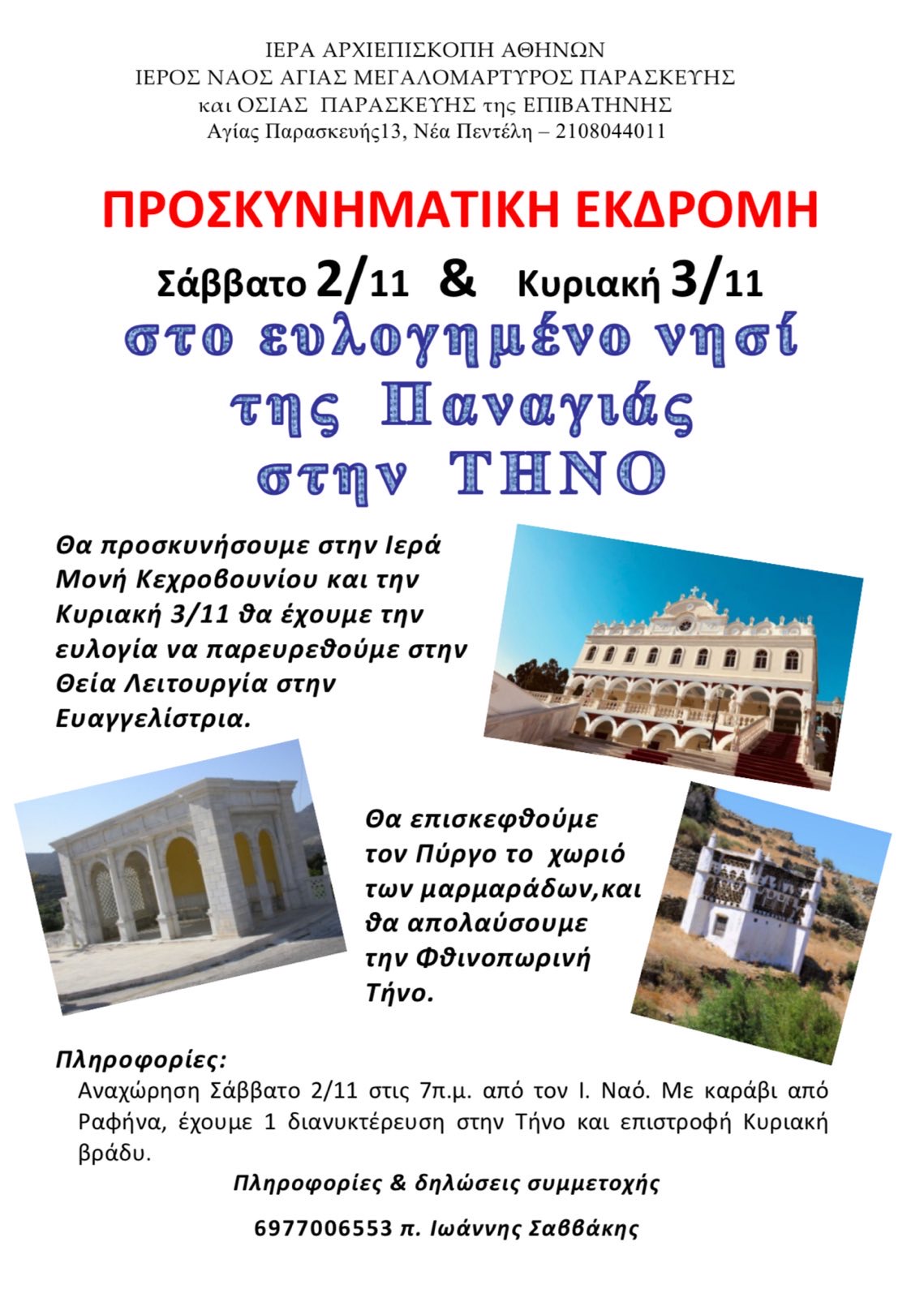 Προσκυνηματική εκδρομή στην Τήνο 2&3 Νοεμβρίου Announcements, Ανακοινώσεις Προσκυνηματική εκδρομή στην Τήνο 2&3 Νοεμβρίου Περισσότερα